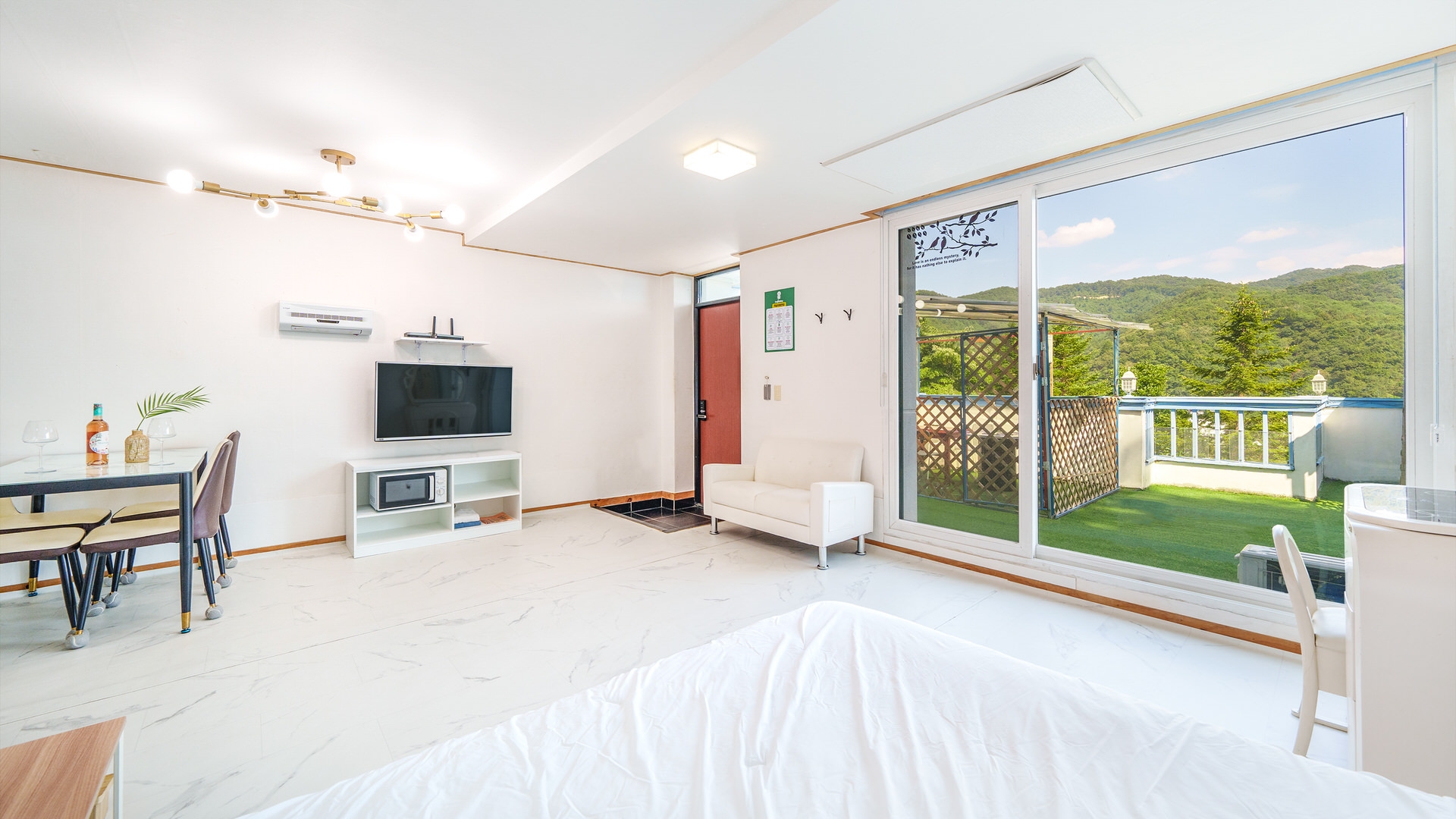 - 집기품목 : TV, 개별바비큐, 금연, 타월, 전기밥솥, 에어컨, 바디워시, 드라이기, 냉장고, 샴푸, 비누, 침대방, 테라스, 와이파이, 인덕션, 전자레인지, 커피포트, 치약, 취사시설/도구, 린스, 화장대, 화재 감지기, 욕실용품, 애견운동장, 산전망